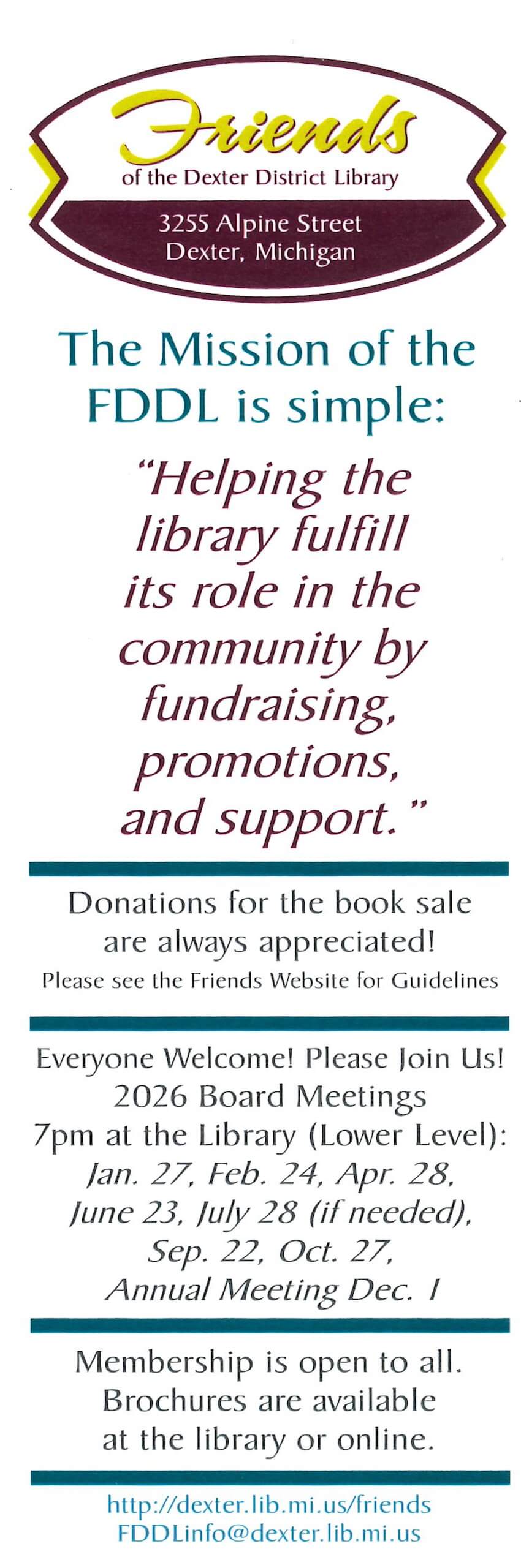The Friends of the Dexter District Library was organized in 1957 and is a non-profit volunteer organization whose primary purpose is to support the Dexter District Library.
